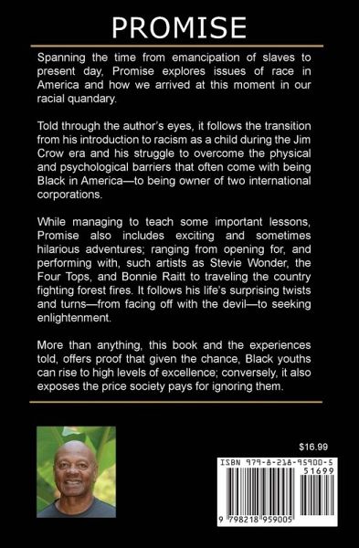 Spanning the time from emancipation of slaves to present day, Promise explores issues of race in America and how we arrived at this moment in our racial quandary. Told through the author's eyes, it follows the transition from his introduction to racism as a child during the Jim Crow era and his struggle to overcome the physical and psychological barriers that often come with being Black in America-to being owner of two international corporations. While managing to teach some important lessons, Promise also includes exciting and sometimes hilarious adventures; ranging from opening for, and performing with, such artists as Stevie Wonder, the Four Tops, and Bonnie Raitt to traveling the country fighting forest fires. It follows his life's surprising twists and turns-from facing off with the devil and seeking enlightenment-to being a successful business owner. More than anything, this book and the experiences told, offers proof that given the chance, Black youths can rise to high levels of excellence; conversely, it also exposes the price society pays for ignoring them.