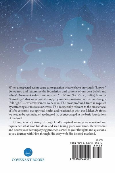 When unexpected events cause us to question what we have previously "known," do we stop and reexamine the foundation and content of our own beliefs and values? Do we seek to learn and separate "truth" and "facts" (i.e., reality) from the "knowledge" that we acquired simply by rote memorization or that we thought "felt right" -- what we wanted to be true. The most profound truth is acquired by correcting our mistakes or errors. This is especially relevant to the most crucial of life's concerns: our spiritual health and relationship with our Maker. At times, we need to be reminded of, reeducated in, or encouraged in the basic foundations of life itself. Come, take a journey through God's inspired message to mankind and experience what God has done and seen taking place over time. He welcomes and desires your accompanying presence, as well as your thoughts and questions, as you journey with Him through His story with His beloved mankind.