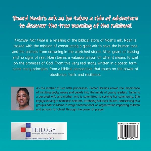 Board Noah's ark as he takes a ride of adventure Board Noah's ark as he takes a ride of adventure to discover the true meaning of the rainbow! Promise, Not Pride is a retelling of the biblical story of Noah's ark. Noah is tasked with the mission of constructing a giant ark to save the human race and the animals from drowning in the wretched storm. After years of teasing and no signs of rain, Noah learns a valuable lesson on what it means to wait on the promises of God. From this very real story, written in a poetic form, come many principles from a biblical perspective that touch on the power of obedience, faith, and resilience.