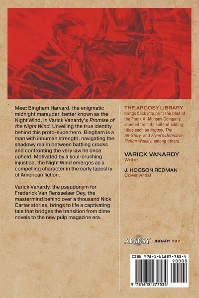 Meet Bingham Harvard, the enigmatic midnight marauder, better known as the Night Wind, in Varick Vanardy's Promise of the Night Wind. Unveiling the true identity behind this proto-superhero, Bingham is a man with inhuman strength, navigating the shadowy realm between battling crooks and confronting the very law he once upheld. Motivated by a soul-crushing injustice, the Night Wind emerges as a compelling character in the early tapestry of American fiction. Varick Vanardy, the pseudonym for Frederick Van Rensselaer Dey, the mastermind behind over a thousand Nick Carter stories, brings to life a captivating tale that bridges the transition from dime novels to the new pulp magazine era.