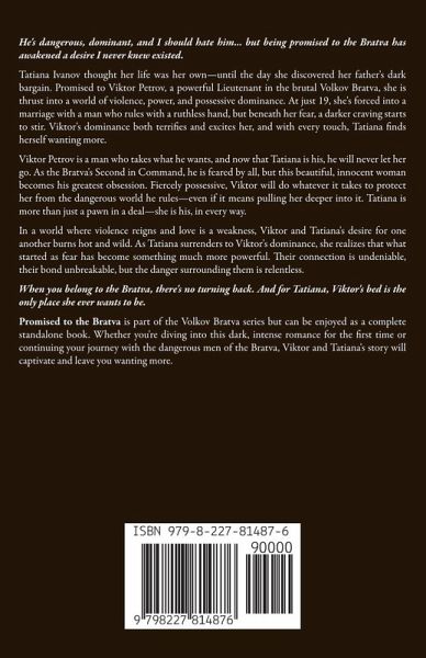 He's dangerous, dominant, and I should hate him... but being promised to the Bratva has awakened a desire I never knew existed. Tatiana Ivanov thought her life was her own-until the day she discovered her father's dark bargain. Promised to Viktor Petrov, a powerful Lieutenant in the brutal Volkov Bratva, she is thrust into a world of violence, power, and possessive dominance. At just 19, she's forced into a marriage with a man who rules with a ruthless hand, but beneath her fear, a darker craving starts to stir. Viktor's dominance both terrifies and excites her, and with every touch, Tatiana finds herself wanting more. Viktor Petrov is a man who takes what he wants, and now that Tatiana is his, he will never let her go. As the Bratva's Second in Command, he is feared by all, but this beautiful, innocent woman becomes his greatest obsession. Fiercely possessive, Viktor will do whatever it takes to protect her from the dangerous world he rules-even if it means pulling her deeper into it. Tatiana is more than just a pawn in a deal-she is his, in every way. In a world where violence reigns and love is a weakness, Viktor and Tatiana's desire for one another burns hot and wild. As Tatiana surrenders to Viktor's dominance, she realizes that what started as fear has become something much more powerful. Their connection is undeniable, their bond unbreakable, but the danger surrounding them is relentless. When you belong to the Bratva, there's no turning back. And for Tatiana, Viktor's bed is the only place she ever wants to be. Promised to the Bratva is part of the Volkov Bratva series but can be enjoyed as a complete standalone book. Whether you're diving into this dark, intense romance for the first time or continuing your journey with the dangerous men of the Bratva, Viktor and Tatiana's story will captivate and leave you wanting more.