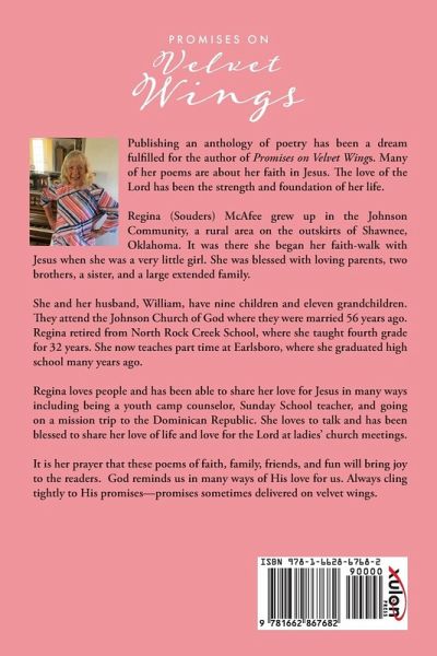 Publishing an anthology of poetry has been a dream fulfilled for the author of Promises on Velvet Wings. Many of her poems are about her faith in Jesus. The love of the Lord has been the strength and foundation of her life. Regina (Souders) McAfee grew up in the Johnson Community, a rural area on the outskirts of Shawnee, Oklahoma. It was there she began her faith-walk with Jesus when she was a very little girl. She was blessed with loving parents, two brothers, a sister, and a large extended family. She and her husband, William, have nine children and eleven grandchildren. They attend the Johnson Church of God where they were married 56 years ago. Regina retired from North Rock Creek School, where she taught fourth grade for 32 years. She now teaches part time at Earlsboro, where she graduated high school many years ago. Regina loves people and has been able to share her love for Jesus in many ways including being a youth camp counselor, Sunday School teacher, and going on a mission trip to the Dominican Republic. She loves to talk and has been blessed to share her love of life and love for the Lord at ladies' church meetings. It is her prayer that these poems of faith, family, friends, and fun will bring joy to the readers. God reminds us in many ways of His love for us. Always cling tightly to His promises-promises sometimes delivered on velvet wings.