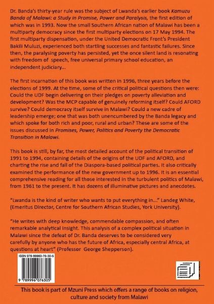 Dr. Banda's thirty-year rule was the subject of Lwanda's earlier book Kamuzu Banda of Malawi: a Study in Promise, Power and Paralysis, the first edition of which was in 1993. Now the small Southern African nation of Malawi has been a multiparty democracy since the first multiparty elections on 17 May 1994. The first multiparty dispensation, under the United Democratic Front's President Bakili Muluzi, experienced both startling successes and fantastic failures. Since then, the paralysing poverty has persisted, yet the once silent land is resonating with freedom of speech, free universal primary school education, an independent judiciary... The first incarnation of this book was written in 1996, three years before the elections of 1999. At the time, some of the critical political questions then were: Could the UDF begin delivering on their pledges on poverty alleviation and development? Was the MCP capable of genuinely reforming itself? Could AFORD survive? Could democracy itself survive in Malawi? Could a new cadre of leadership emerge; one that was both unencumbered by the Banda legacy and which spoke for both rich and poor, rural and urban? These are some of the issues discussed in Promises, Power, Politics and Poverty the Democratic Transition in Malawi. This book is still, by far, the most detailed account of the political transition of 1991 to 1994, containing details of the origins of the UDF and AFORD, and charting the rise and fall of the Diaspora-based political parties. It also critically examined the performance of the new government up to 1996. It is an essential comprehensive reading for all those interested in the turbulent politics of Malawi, from 1961 to the present. It has dozens of illuminative pictures and anecdotes.