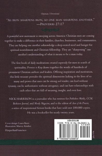 A powerful new movement is sweeping across America: Christian men are coming together to make a difference in their families, churches, businesses, and communities.They are helping one another acknowledge a deep-seated need and hunger for spiritual nourishment and Christian fellowship. They are "sharpening" one another's understanding of what it means to be a man today. The first book of daily meditations created expressly for men in search of spirituality, Promises to Keep draws together the words of hundreds of prominent Christian authors and leaders. Offering inspiration and motivation, this little treasure provides the spiritual dimensions lacking in the lives of so many and proves that men can be strong and tender, can lead without tyranny, can be authoritative without arrogance, and can have relationships with each other that are full of meaning, insight, and even love.