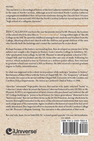 Ben Callahan was born the year his parents moved to Mt. Pleasant, the location of the school which he describes in "Promises Unfulfilled". Living within sight of "the old College on the hill," he spent his childhood among former students and teachers from the College, attending school and church with the children and grand-children of the men who literally built the buildings and created the institutions he writes about. Perhaps because of the history surrounding him, Ben developed an intense love of the subject and sought a BA Degree in History from Catawba College in Salisbury, NC. After graduation from college, he left Mt. Pleasant to attend graduate school at UNC-Chapel Hill, and was drafted into the US Army after one year of study. Following his service, which included a tour in Vietnam as a military police officer, Ben returned to graduate school and received a MA in History. He later received a second graduate degree in Public Administration. In what was supposed to be a short-term position while seeking a "position in history," Ben became a Police Officer with the Town of Chapel Hill, NC. The "temporary" job lasted for twenty-five years as he served with the Chapel Hill, University of North Carolina and Carrboro Police Departments. He retired as Carrboro's Chief of Police in 1998. Upon his "retirement" from public Service, Ben and his wife, Janet, returned "home" to Cabarrus County where he joined the Eastern Cabarrus Historical Society (ECHS) in Mt. Pleasant. ECHS is an organization of local citizens who purchased and restored the old NC College buildings to "preserve local history for future generations." Returned to his "historical roots," Ben served three terms as the ECHS President, during which time he became thoroughly enmeshed in the story of the educational institutions that were once such a large part of his community. Again involved in the historical research he had never really abandoned, Ben began his effort to document the story of North Carolina College and Mt. Pleasant Collegiate Institute. This narrative is the culmination of this work. Ben and wife, Janet, live in Gold Hill, NC in Janet's grand-parents' 116 year old farmhouse.
