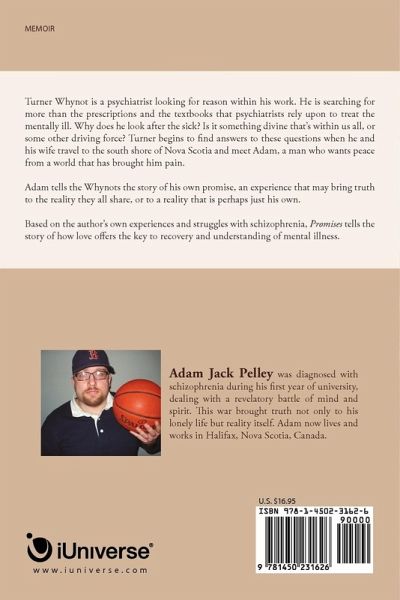 Turner Whynot is a psychiatrist looking for reason within his work. He is searching for more than the prescriptions and the textbooks that psychiatrists rely upon to treat the mentally ill. Why does he look after the sick? Is it something divine that's within us all, or some other driving force? Turner begins to find answers to these questions when he and his wife travel to the south shore of Nova Scotia and meet Adam, a patient in a psychiatric facility there who wants peace from a world that has brought him pain. Adam tells the Whynots the story of his own promise, an experience that may bring truth to the reality they all share, or to a reality that is perhaps just his own. Based on the author's own experiences and struggles with schizophrenia, Promises tells the story of how love offers the key to recovery and understanding of mental illness.