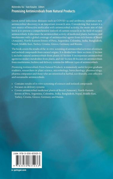Given novel infectious diseases such as COVID-19 and antibiotic resistance new antimicrobial discovery is an important research area. Considering that nature is a vast source of bioactive molecules with antimicrobial activity, the main aim of this book is to present a comprehensive outlook of current research in the field of natural antimicrobials. It discusses the antimicrobial activity of medicinal plants, beehives, and mushrooms with a global coverage of antimicrobial agents from rich forests of Brazil (Amazon), North-Eastern forests of Peru, Argentina, Colombia, India, Bangladesh, Nepal, Middle East, Turkey, Croatia, Greece, Germany and Russia.