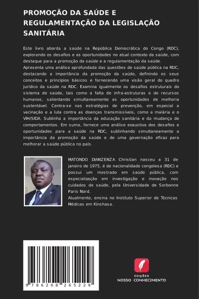 Este livro aborda a saúde na República Democrática do Congo (RDC), explorando os desafios e as oportunidades no atual contexto da saúde, com destaque para a promoção da saúde e a regulamentação da saúde. Apresenta uma análise aprofundada das questões de saúde pública na RDC, destacando a importância da promoção da saúde, definindo os seus conceitos e princípios básicos e fornecendo uma visão geral do quadro jurídico da saúde na RDC. Examina igualmente os desafios estruturais do sistema de saúde, tais como a falta de infra-estruturas e de recursos humanos, salientando simultaneamente as oportunidades de melhoria sustentável. Centra-se nas estratégias de prevenção, em especial a vacinação e a luta contra as doenças transmissíveis, como a malária e o VIH/SIDA. Sublinha a importância da educação sanitária e da mudança de comportamentos. Em suma, fornece uma análise exaustiva dos desafios e oportunidades para a saúde na RDC, sublinhando simultaneamente a importância da promoção da saúde e de uma governação eficaz para melhorar a saúde pública no país.
