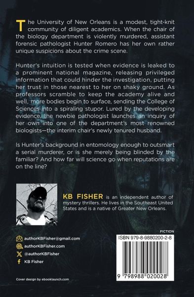 How far will science go when reputations are on the line? The University of New Orleans is a modest, tight-knit community of diligent academics. When the chair of the biology department is violently murdered, assistant forensic pathologist Hunter Romero has her own rather unique suspicions about the crime scene. Hunter's intuition is tested when evidence is leaked to a prominent national magazine, releasing privileged information that could hinder the investigation, putting her trust in those nearest to her on shaky ground. As professors scramble to keep the academy alive and well, more bodies begin to surface, sending the College of Sciences into a spiraling stupor. Lured by the developing evidence, the newbie pathologist launches an inquiry of her own into one of the department's most renowned biologists-the interim chair's newly tenured husband. Is Hunter's background in entomology enough to outsmart a serial murderer, or is she merely being blinded by the familiar? And how far will science go when reputations are on the line?