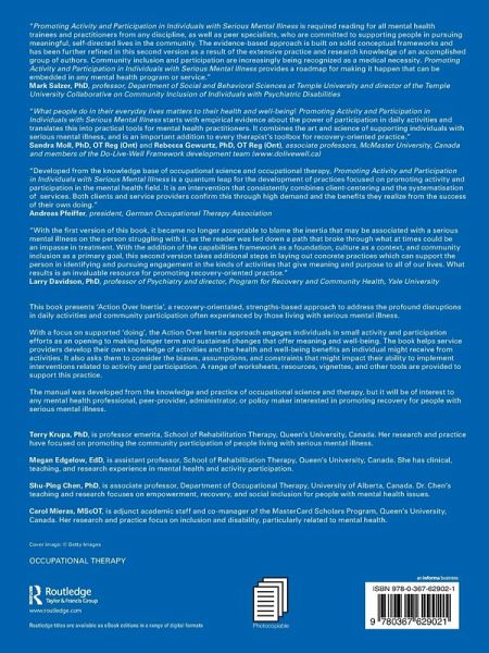 "What people do in their everyday lives matters to their health and well-being! Action over Inertia starts with empirical evidence about the power of participation in daily activities and translates this into practical tools for mental health practitioners. It combines the art and science of supporting individuals with serious mental illness, and is an important addition to every therapist's toolbox for recovery-oriented practice." -Sandra Moll, PhD, OT Reg (Ont) and Rebecca Gewurtz, PhD, OT Reg (Ont), associate professors, McMaster University, Canada and members of the Do-Live-Well Framework development team (www.dolivewell.ca)