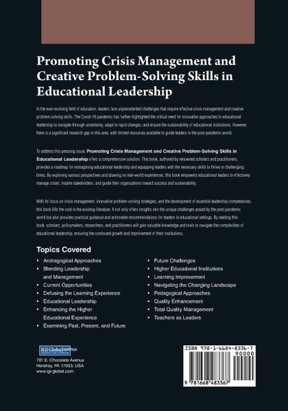 In the dynamic field of education, leaders confront unprecedented challenges necessitating effective crisis management and creative problem-solving skills. The Covid-19 pandemic has underscored the criticality of innovative approaches to educational leadership, enabling leaders to navigate uncertainty, adapt to rapid changes, and sustain educational institutions. Nevertheless, limited resources exist to guide leaders in the post-pandemic world, revealing a significant research gap. Promoting Crisis Management and Creative Problem-Solving Skills in Educational Leadership addresses this urgent issue by offering a comprehensive solution. Authored by renowned scholars and practitioners, this book presents a roadmap for reimagining educational leadership, equipping leaders with the necessary skills to thrive in challenging times. By exploring diverse perspectives and drawing from real-world experiences, the book empowers educational leaders to effectively manage crises, inspire stakeholders, and guide organizations toward success and sustainability. By focusing on crisis management, innovative problem-solving strategies, and the development of essential leadership competencies, this book fills the void in the current literature. It not only provides insights into the distinctive challenges of the post-pandemic world but also offers practical guidance and actionable recommendations for leaders in educational settings. Scholars, policymakers, researchers, and practitioners who engage with this book will gain valuable knowledge and tools to navigate the complexities of educational leadership, ensuring the continuous growth and enhancement of their institutions.