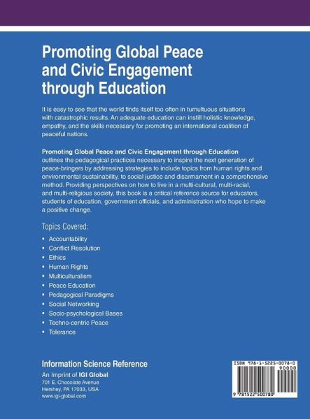 It is easy to see that the world finds itself too often in tumultuous situations with catastrophic results. An adequate education can instill holistic knowledge, empathy, and the skills necessary for promoting an international coalition of peaceful nations. Promoting Global Peace and Civic Engagement through Education outlines the pedagogical practices necessary to inspire the next generation of peace-bringers by addressing strategies to include topics from human rights and environmental sustainability, to social justice and disarmament in a comprehensive method. Providing perspectives on how to live in a multi-cultural, multi-racial, and multi-religious society, this book is a critical reference source for educators, students of education, government officials, and administration who hope to make a positive change.