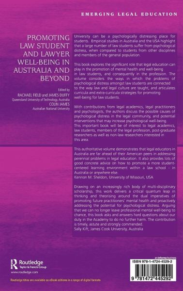 This book explores the significant role that legal education can play in the promotion of mental health and well-being in law students, and consequently in the profession. The volume considers the ways in which the problems of psychological distress amongst law students are connected to the way law and legal culture are taught, and articulates curricula and extra-curricula strategies for promoting wellbeing for law students. The chapters are contributed by leading legal academics, legal practitioners and psychologists.