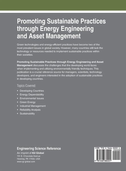Green technologies and energy-efficient practices have become two of the most prevalent issues in global society. However, many countries still lack the technology or resources needed to implement sustainable practices within their societies. Promoting Sustainable Practices through Energy Engineering and Asset Management discusses the challenges that the developing world faces when implementing and utilizing environmentally friendly techniques. This publication is a crucial reference source for managers, scientists, technology developers, and engineers interested in the adoption of sustainable practices in developing countries.