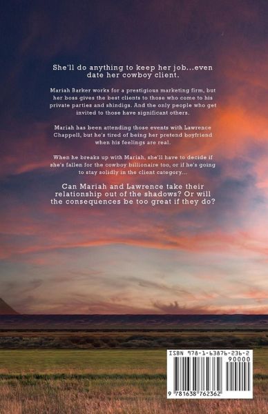 She'll do anything to keep her job...even date her cowboy client. Mariah Barker works for a prestigious marketing firm, but her boss gives the best clients to those who come to his private parties and shindigs. And the only people who get invited to those have significant others. Mariah has been attending those events with Lawrence Chappell, but he's tired of being her pretend boyfriend when his feelings are real. When he breaks up with Mariah, she'll have to decide if she's fallen for the cowboy billionaire too, or if he's going to stay solidly in the client category... Can Mariah and Lawrence take their relationship out of the shadows? Or will the consequences be too great if they do?