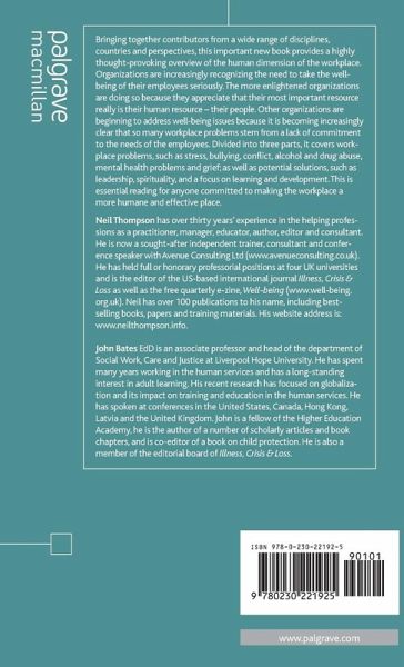 Preface Acknowledgements Introduction PART I: WORKPLACE PROBLEMS Stress; N.Thompson Conflict, Aggression and Bullying; N.Thompson & L.Brooksbank Drug and Alcohol Problems; I.Madoc Jones Mental Health Problems; S.Desai Racism; G.Singh Loss, Grief and Trauma; N.Thompson & S.Thompson PART II: PROMOTING WELL-BEING Learning and Development; J.Bates Leadership; P.Gilbert Managing Sickness Absence; M.Tehan Women-friendly Workplaces; B.Metcalf Spirituality in the Workplace; B.Moss PART III: INTERNATIONAL PERSPECTIVES A United States Perspective; S.de Mello A Hong Kong Perspective; S.Ng An Australian Perspective; J.Bottomley A Greek Perspective; V.Ioakimidis An Indian Perspective; G.Prem Singh Conclusion References Index