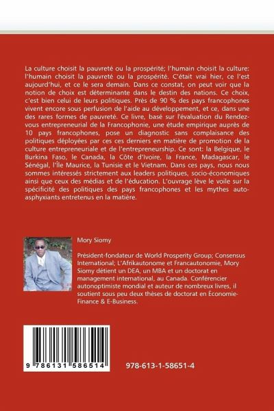 La culture choisit la pauvreté ou la prospérité; l'humain choisit la culture: l'humain choisit la pauvreté ou la prospérité. C'était vrai hier, ce l'est aujourd'hui, et ce le sera demain. Dans ce constat, on peut voir que la notion de choix est déterminante dans le destin des nations. Ce choix, c'est bien celui de leurs politiques. Près de 90 % des pays francophones vivent encore sous perfusion de l'aide au développement, et ce, dans une des rares formes de pauvreté. Ce livre, basé sur l'évaluation du Rendez-vous entrepreneurial de la Francophonie, une étude empirique auprès de 10 pays francophones, pose un diagnostic sans complaisance des politiques déployées par ces ces derniers en matière de promotion de la culture entrepreneuriale et de l'entrepreneurship. Ce sont: la Belgique, le Burkina Faso, le Canada, la Côte d'Ivoire, la France, Madagascar, le Sénégal, l'Île Maurice, la Tunisie et le Vietnam. Dans ces pays, nous nous sommes intéressés strictement aux leaders politiques, socio-économiques ainsi que ceux des médias et de l'éducation. L'ouvrage lève le voile sur la spécificité des politiques des pays francophones et les mythes auto-asphyxiants entretenus en la matière.
