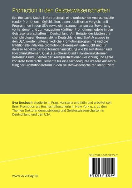 Eva Bosbachs Studie liefert erstmals eine umfassende Analyse existierender Promotionsmöglichkeiten, einen detaillierten Vergleich mit Programmen in den USA sowie ein Instrumentarium zur Bewertung vorhandener und zur Konzeption künftiger Promotionsmodelle in den Geisteswissenschaften in Deutschland. Am Beispiel der Muttersprachenphilologien Germanistik in Deutschland und English studies in den USA werden verschiedene Promotionsprogramme und die traditionelle Individualpromotion differenziert untersucht und für diverse Aspekte der Doktorandenausbildung wie Dissertationen und Forschungsthemen, Qualitätssicherung und Finanzierungsformen, Betreuung und Erlernen der Kernqualifikationen Forschung und Lehre konkrete förderliche Elemente für eine fachadäquate weitere Ausgestaltung der Promotionsreform in den Geisteswissenschaften identifiziert.