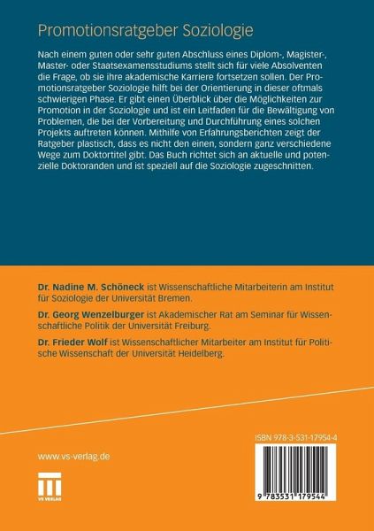 Nach einem guten oder sehr guten Abschluss eines Diplom-, Magister-, Master- oder Staatsexamensstudiums stellt sich für viele Absolventen die Frage, ob sie ihre akademische Karriere fortsetzen sollen. Der Promotionsratgeber Soziologie hilft bei der Orientierung in dieser oftmals schwierigen Phase. Er gibt einen Überblick über die Möglichkeiten zur Promotion in der Soziologie und ist ein Leitfaden für die Bewältigung von Problemen, die bei der Vorbereitung und Durchführung eines solchen Projekts auftreten können. Mithilfe von Erfahrungsberichten zeigt der Ratgeber plastisch, dass es nicht den einen, sondern ganz verschiedene Wege zum Doktortitel gibt. Das Buch richtet sich an aktuelle und potenzielle Doktoranden und ist speziell auf die Soziologie zugeschnitten.