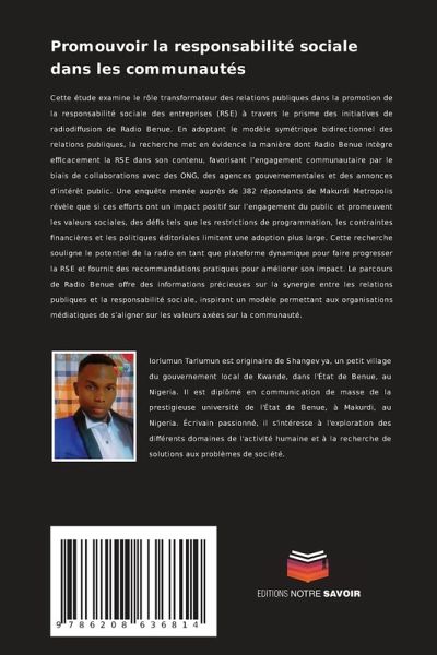 Cette étude examine le rôle transformateur des relations publiques dans la promotion de la responsabilité sociale des entreprises (RSE) à travers le prisme des initiatives de radiodiffusion de Radio Benue. En adoptant le modèle symétrique bidirectionnel des relations publiques, la recherche met en évidence la manière dont Radio Benue intègre efficacement la RSE dans son contenu, favorisant l'engagement communautaire par le biais de collaborations avec des ONG, des agences gouvernementales et des annonces d'intérêt public. Une enquête menée auprès de 382 répondants de Makurdi Metropolis révèle que si ces efforts ont un impact positif sur l'engagement du public et promeuvent les valeurs sociales, des défis tels que les restrictions de programmation, les contraintes financières et les politiques éditoriales limitent une adoption plus large. Cette recherche souligne le potentiel de la radio en tant que plateforme dynamique pour faire progresser la RSE et fournit des recommandations pratiques pour améliorer son impact. Le parcours de Radio Benue offre des informations précieuses sur la synergie entre les relations publiques et la responsabilité sociale, inspirant un modèle permettant aux organisations médiatiques de s'aligner sur les valeurs axées sur la communauté.