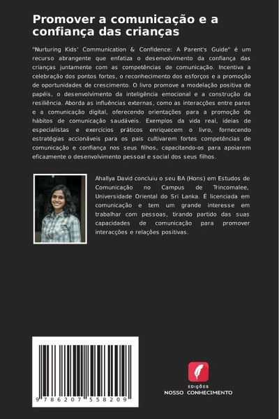 "Nurturing Kids' Communication & Confidence: A Parent's Guide" é um recurso abrangente que enfatiza o desenvolvimento da confiança das crianças juntamente com as competências de comunicação. Incentiva a celebração dos pontos fortes, o reconhecimento dos esforços e a promoção de oportunidades de crescimento. O livro promove a modelação positiva de papéis, o desenvolvimento da inteligência emocional e a construção da resiliência. Aborda as influências externas, como as interacções entre pares e a comunicação digital, oferecendo orientações para a promoção de hábitos de comunicação saudáveis. Exemplos da vida real, ideias de especialistas e exercícios práticos enriquecem o livro, fornecendo estratégias accionáveis para os pais cultivarem fortes competências de comunicação e confiança nos seus filhos, capacitando-os para apoiarem eficazmente o desenvolvimento pessoal e social dos seus filhos.