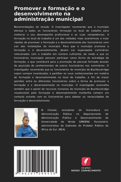 Recomendações do estudo. O investigador recomenda que o município ofereça a todos os funcionários formação no local de trabalho para melhorar o seu desempenho profissional e as suas competências. A formação no local de trabalho é um dos métodos mais económicos e mais rápidos de promover a formação e o desenvolvimento dos funcionários sem sair das instalações do município. Para que o município promova a formação e o desenvolvimento, devem ser organizados seminários relacionados com o trabalho em número suficiente, de modo a que os funcionários municipais possam participar como forma de estratégia de formação, o que contribuirá para a promoção de pessoal formado através da aquisição de conhecimentos de outros funcionários nos seminários. O investigador recomenda que os funcionários do município de Bushbuckridge sejam sempre incentivados a partilhar os seus conhecimentos em matéria de formação e desenvolvimento no local de trabalho, a fim de trocar opiniões entre os diferentes funcionários sobre a forma de promover a formação e o desenvolvimento no município. O investigador aconselha também que o painel de recursos humanos do município de Bushbuckridge responsável pela formação e desenvolvimento mantenha sempre um contacto estreito com os funcionários para detetar as necessidades de formação e desenvolvimento.
