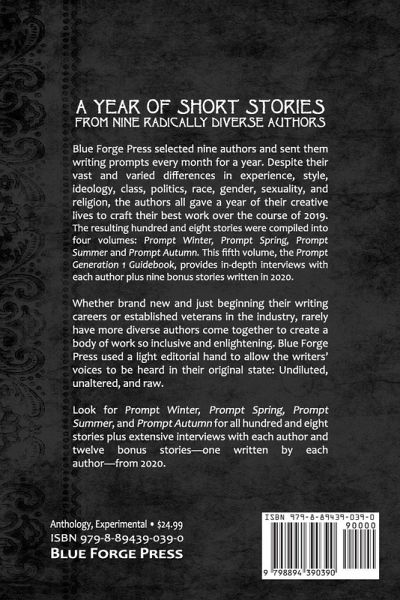 A Year of Short Stories from Nine Radically Different Authors Blue Forge Press selected nine authors and sent them writing prompts every month for a year. Despite their vast and varied differences in experience, style, ideology, class, politics, race, gender, sexuality, and religion, the authors all gave a year of their creative lives to craft their best work over the course of 2019. The resulting hundred and eight stories were compiled into four volumes: Prompt Winter, Prompt Spring, Prompt Summer and Prompt Autumn. This fifth volume, the Prompt Generation 1 Guidebook, provides in-depth interviews with each author plus nine bonus stories written in 2020. Whether brand new and just beginning their writing careers or established veterans in the industry, rarely have more diverse authors come together to create a body of work so inclusive and enlightening. Blue Forge Press used a light editorial hand to allow the writers' voices to be heard in their original state: Undiluted, unaltered, and raw. Look for Prompt Winter, Prompt Spring, Prompt Summer, and Prompt Autumn for all hundred and eight stories plus extensive interviews with each author and twelve bonus stories-one written by each author-from 2020.