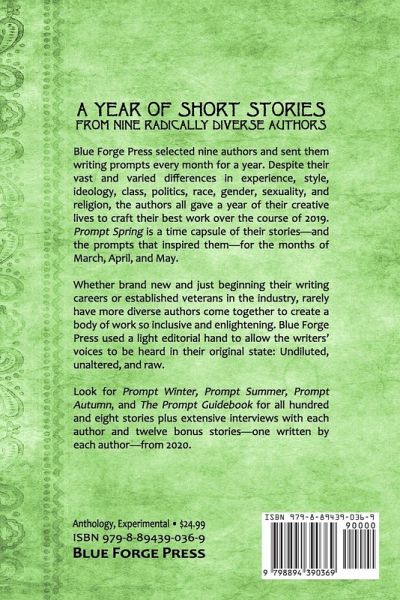 A Year of Short Stories from Nine Radically Diverse Authors Blue Forge Press selected nine authors and sent them writing prompts every month for a year. Despite their vast and varied differences in experience, style, ideology, class, politics, race, gender, sexuality, and religion, the authors all gave a year of their creative lives to craft their best work over the course of 2019. Prompt Spring is a time capsule of their stories-and the prompts that inspired them-for the months of March, April, and May. Whether brand new and just beginning their writing careers or established veterans in the industry, rarely have more diverse authors come together to create a body of work so inclusive and enlightening. Blue Forge Press used a light editorial hand to allow the writers' voices to be heard in their original state: Undiluted, unaltered, and raw. Look for Prompt Winter, Prompt Summer, Prompt Autumn, and The Prompt Guidebook for all hundred and eight stories plus extensive interviews with each author and twelve bonus stories-one written by each author-from 2020.