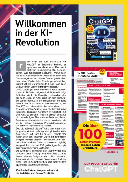 Bessere Prompts, bessere Ergebnisse: Ein eigenes Kapitel für die perfekte Eingabe Direkt loslegen: 100 geniale Prompts zum Ausprobieren & Anpassen Immer auf dem neuesten Stand: Nutze die aktuellsten Funktionen von ChatGPT
