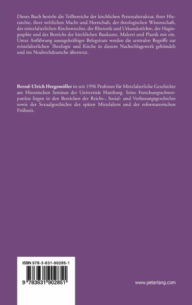 Dieses Buch bezieht die Teilbereiche der kirchlichen Personalstruktur, ihrer Hierarchie, ihrer weltlichen Macht und Herrschaft, der theologischen Wissenschaft, des mittelalterlichen Kirchenrechts, der Rhetorik und Urkundenlehre, der Hagiographie und des Bereichs der kirchlichen Baukunst, Malerei und Plastik mit ein. Unter Anführung aussagekräftiger Belegzitate werden die zentralen Begriffe zur mittelalterlichen Theologie und Kirche in diesem Nachschlagewerk gebündelt und ins Neuhochdeutsche übersetzt.