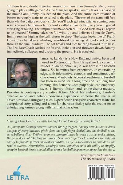 James A. Landry is a New England native, born and raised in Portsmouth, New Hampshire He currently resides in San Antonio, TX. J.A. was born into a baseball family. So, he writes from experience, an entertaining edge, with informative, comedic and sometimes dark characters and subplots. A book about him and baseball has been in mind for a long time and is a long time coming. His fiction includes pulp style, contemporary style, literary fiction and crime-drama-mystery. Pronator is contemporary creative fiction About his endeavors, Landry's creative mind and behind-the-scenes experience immerse the reader in adventurous and intriguing tales. Expert fiction brings his characters to life; his exceptional story-telling and talent for character dialog take the reader on an entertaining journey along with his main characters.