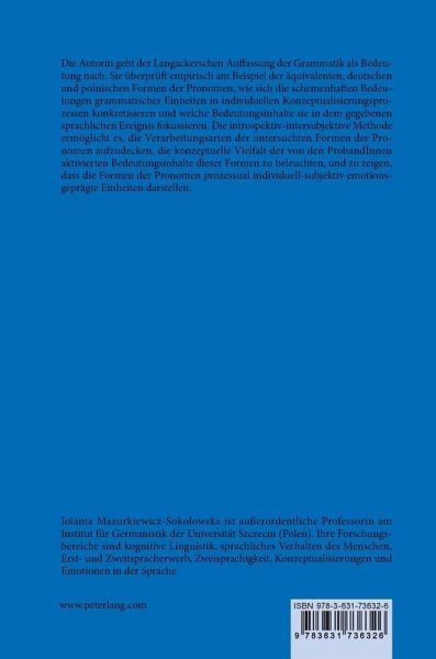Die Autorin geht der Langackerschen Auffassung der Grammatik als Bedeutung nach. Sie überprüft empirisch am Beispiel der äquivalenten, deutschen und polnischen Formen der Pronomen, wie sich die schemenhaften Bedeutungen grammatischer Einheiten in individuellen Konzeptualisierungsprozessen konkretisieren und welche Bedeutungsinhalte sie in dem gegebenen sprachlichen Ereignis fokussieren. Die introspektiv-intersubjektive Methode ermöglicht es, die Verarbeitungsarten der untersuchten Formen der Pronomen aufzudecken, die konzeptuelle Vielfalt der von den ProbandInnen aktivierten Bedeutungsinhalte dieser Formen zu beleuchten, und zu zeigen, dass die Formen der Pronomen prozessual individuell-subjektiv emotionsgeprägte Einheiten darstellen.