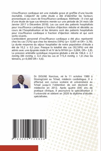 L'insuffisance cardiaque est une maladie grave et greffée d'une lourde mortalité. L'objectif de cette étude a été d'identifier les facteurs pronostiques au cours de l'insuffisance cardiaque. Méthode : il s'est agi d'une étude de type cas-témoins menée sur une période de 24 mois (de Janvier 2017 à Décembre 2018). Les cas sont des patients hospitalisés pour insuffisance cardiaque à fraction d'éjection réduite et décédés au cours de l'hospitalisation et les témoins sont des patients hospitalisés pour insuffisance cardiaque à fraction d'éjection réduite et qui sont sortis vivants. L'antécédent personnel d'insuffisance cardiaque a été plus représenté chez les cas (72%) que chez les témoins (59%) (p< 0,001 et OR= 3,78). La durée moyenne du séjour hospitalier de notre population d'étude a été de 10,2 ± 0,5 jour. Presque la totalité des cas (92,59%) ont été admis avec une dyspnée stade III et IV de la NYHA (p= 0,004, OR= 2,8). La pression artérielle systolique moyenne globale a été de 106,6 ± 2,1 mmHg (80 mmHg ± 4,4 chez les cas et 115,4 mmHg ± 1,8 chez les témoins, p=0,000 OR= 4,6).