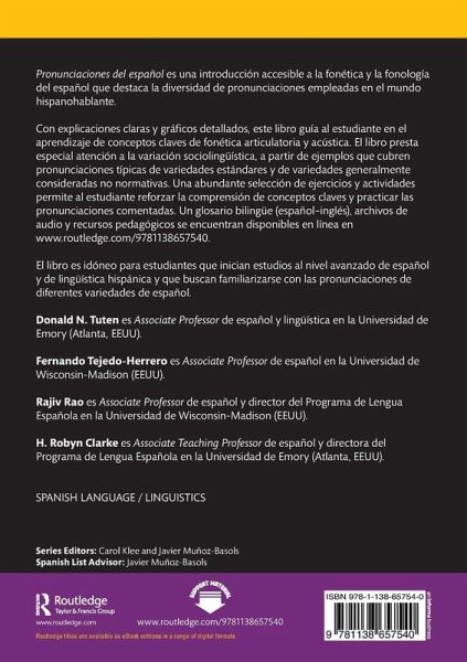 Con explicaciones claras y gráficos detallados, este libro guía al estudiante en el aprendizaje de conceptos claves de fonética articulatoria y acústica. El libro presta especial atención a la variación sociolingüística, a partir de ejemplos que cubren pronunciaciones típicas de variedades estándares y de variedades generalmente consideradas no normativas. Una abundante selección de ejercicios y actividades permite al estudiante reforzar la comprensión de conceptos claves y practicar las pronunciaciones comentadas. Un glosario bilingüe (español-inglés), archivos de audio y recursos pedagógicos se encuentran disponibles en línea en www.routledge.com/9781138657540.