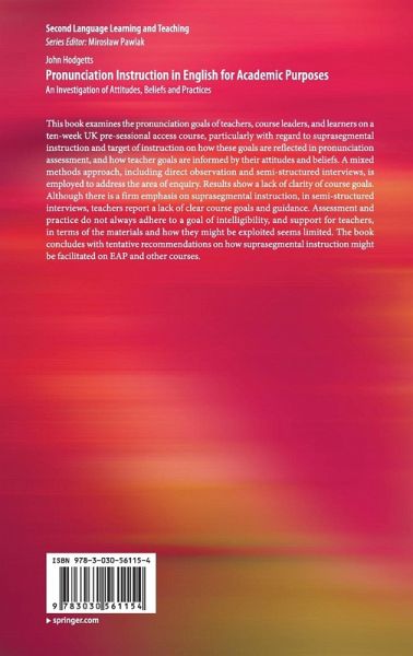 This book examines the pronunciation goals of teachers, course leaders, and learners on a ten-week UK pre-sessional access course, particularly with regard to suprasegmental instruction and target of instruction on how these goals are reflected in pronunciation assessment, and how teacher goals are informed by their attitudes and beliefs. A mixed methods approach, including direct observation and semi-structured interviews, is employed to address the area of enquiry. Results show a lack of clarity of course goals. Although there is a firm emphasis on suprasegmental instruction, in semi-structured interviews, teachers report a lack of clear course goals and guidance. Assessment and practice do not always adhere to a goal of intelligibility, and support for teachers, in terms of the materials and how they might be exploited seems limited. The book concludes with tentative recommendations on how suprasegmental instruction might be facilitated on EAP and other courses