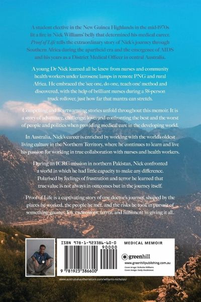 A student elective in the New Guinea Highlands in the mid-1970s lit a fire in Nick Williams' belly that determined his medical career. Proof of Life tells the extraordinary story of Nick's journey through Southern Africa during the apartheid era, the emergence of AIDS and his years as a District Medical Officer in central Australia. A young Dr Nick learned all he knew from nurses and community health workers under kerosene lamps in remote PNG and rural Africa. He embraced the 'see one, do one, teach one' method and discovered, with the help of brilliant nurses during a 58-person truck rollover, just how far that mantra can stretch. Compelling and heart-warming stories unfold throughout this memoir. It's a story of adventure, challenge, love, and confronting the best and the worst of people when providing medical care in the developing world. In Australia, Nick's career is enriched by working with the world's oldest living culture in the Northern Territory, where he continues to live his passion for working in true collaboration with nurses and health workers. During an ICRC mission in northern Pakistan, Nick confronted a world in which he could not make any difference. Polarised by feelings of frustration and terror he realised that true value is not always in outcomes but in the journey itself. Proof of Life is a captivating story of one doctor's journey, shaped by the places he worked, the people he met, and the risks he took to pursue something greater