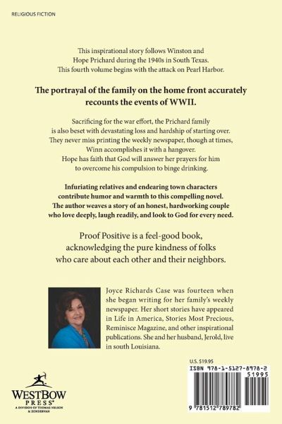This inspirational story follows Winston and Hope Prichard during the 1940s in South Texas. This fourth volume begins with the attack on Pearl Harbor. The portrayal of the family on the home front accurately recounts the events of WWII. Sacrificing for the war effort, the Prichard family is also beset with devastating loss and hardship of starting over. They never miss printing the weekly newspaper, though at times, Winn accomplishes it with a hangover. Hope has faith that God will answer her prayers for him to overcome his compulsion to binge drinking. Infuriating relatives and endearing town characters contribute humor and warmth to this compelling novel. The author weaves a story of an honest, hardworking couple who love deeply, laugh readily, and look to God for every need. Proof Positive is a feel-good book, acknowledging the pure kindness of folks who care about each other and their neighbors.