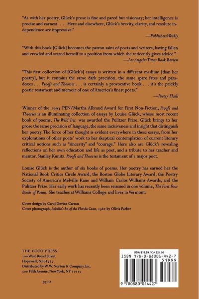 Winner of the 1993 PEN/Martha Albrand Award for First Non-Fiction, "Proofs and Theories" is an illuminating collection of essays by Louise Glü ck, whose most recent book of poems, "The Wild Iris," was awarded the Pulitzer Prize. Glü ck brings to her prose the same precision of language, the same incisiveness and insight that distinguish her poetry. The force of her thought is evident everywhere in these essays, from her explorations of other poets' work to her skeptical contemplation of current literary critical notions such as "sincerety" and "courage." Here also are Glü ck's revealing reflections on her own education and life as a poet, and a tribute to her teacher and mentor, Stanley Kunitz.