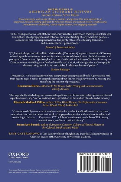 1776 symbolizes a moment, both historical and mythic, of democracy in action. That year witnessed the release of a document, which Edward Bernays, the so-called father of public relations and spin, would later label as a masterstroke of propaganda. Although the Declaration of Independence relies heavily on the empiricism of self-evident truths, Bernays, who had authored the influential manifesto Propaganda in 1928, suggested that what made this iconic document so effective was not its sober rationalism but its inspiring message that ensured its dissemination throughout the American colonies. Propaganda 1776 reframes the culture of the U.S. Revolution and early Republic, revealing it to be rooted in a vast network of propaganda. Drawing on a wide-range of resources, Russ Castronovo considers how the dispersal and circulation--indeed, the propagation--of information and opinion across the various media of the eighteenth century helped speed the flow of revolution. This book challenges conventional wisdom about propaganda as manipulation or lies by examining how popular consent and public opinion in early America relied on the spirited dissemination of rumor, forgery, and invective. While declarations about self-evident truths were important to liberty, the path toward American independence required above all else the spread of unreliable intelligence that travelled at such a pace that it could be neither confirmed nor refuted. By tracking the movements of stolen documents and leaked confidential letters, this book argues that media dissemination created a vital but seldom acknowledged connection between propaganda and democracy. The spread of revolutionary material in the form of newspapers, pamphlets, broadsides, letters, songs, and poems across British North America created multiple networks that spawned new and often radical ideas about political communication. Communication itself became revolutionary in ways that revealed circulation to be propaganda's most vital content. By examining the kinetic aspects of print culture, Propaganda 1776 shows how the mobility of letters, pamphlets, and other texts amounts to political activity par excellence. With original examinations of Ben Franklin, Mercy Otis Warren, Tom Paine, and Philip Freneau, among a crowd of other notorious propagandists, this book examines how colonial men and women popularized and spread the patriot cause across America.