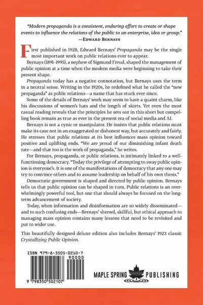 "Modern propaganda is a consistent, enduring effort to create or shape events to influence the relations of the public to an enterprise, idea or group." -Edward Bernays First published in 1928, Edward Bernays' Propaganda may be the single most important work on public relations ever to appear. Bernays (1891-1995), a nephew of Sigmund Freud, shaped the management of public opinion at a time when the modern media were beginning to take their present shape. Propaganda today has a negative connotation, but Bernays uses the term in a neutral sense. Writing in the 1920s, he redefined what he called the "new propaganda" as public relations--a name that has stuck ever since. Some of the details of Bernays' work may seem to have a quaint charm, like his discussions of women's hats and the length of skirts. Yet even the most casual reading reveals that the principles he sets out in this short but compelling book remain as true as ever in the present era of social media and AI. Bernays is not a cynic or manipulator. He insists that public relations must make its case not in an exaggerated or dishonest way, but accurately and fairly. He stresses that public relations at its best influences mass opinion toward positive and uplifting ends. "We are proud of our diminishing infant death rate--and that too is the work of propaganda," he writes. Indeed for Bernays, propaganda, or public relations, is intimately linked to a well-functioning democracy. "Today the privilege of attempting to sway public opinion is everyone's. It is one of the manifestations of democracy that any one may try to convince others and to assume leadership on behalf of his own thesis." Democratic government is shaped and directed by public opinion. Bernays tells us that public opinion can be shaped in turn. Public relations is an overwhelmingly powerful tool, but one that should always be focused on the long-term advancement of society. Today, when information and disinformation are so widely disseminated--and to such confusing ends--Bernays' shrewd, skillful, but ethical approach to managing mass opinion contains many lessons that need to be revisited and put to wider use. This beautifully designed deluxe edition also includes Bernays' 1923 classic Crystallizing Public Opinion.