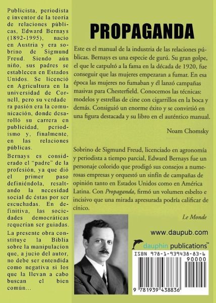 Este es el manual de la industria de las relaciones públicas. Bernays es una especie de gurú. Su gran golpe, el que le catapultó a la fama en la década de 1920, fue conseguir que las mujeres empezaran a fumar. En esa época las mujeres no fumaban y él lanzó campañas masivas para Chesterfield. Conocemos las técnicas: modelos y estrellas de cine con cigarrillos en la boca y demás. Consiguió un enorme éxito y se convirtió en una figura destacada y su libro en el auténtico manual. Publicista, periodista e inventor de la teoría de relaciones públicas, Edward Bernays (1892-1995), nacío en Austria y era sobrino de Sigmund Freud. Siendo aún niño, sus padres se establecen en Estados Unidos. Se licenció en Agricultura en la universidad de Cornell, pero su verdadera pasión era la comunicación, donde desarolló su carrera en publicidad, periodismo y, finalmente, en las relaciones públicas. Bernays es considerado el "padre" de la profesión, ya que dió el primer paso definiéndola, resaltando la necesidad social de éstas por ser escuchadas. En definitiva, las sociedades democráticas requerían ser guiadas. La presente obra constituye la Biblia sobre la manipulacíon que, a jucio del autor, no debe ser entendida como negativa si los que la llevan a cabo buscan el bien común...