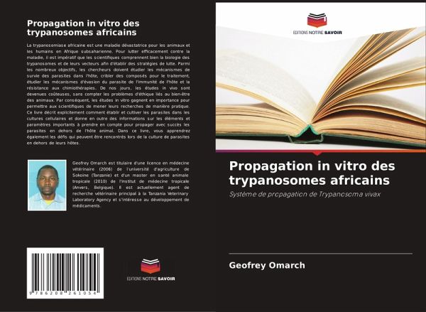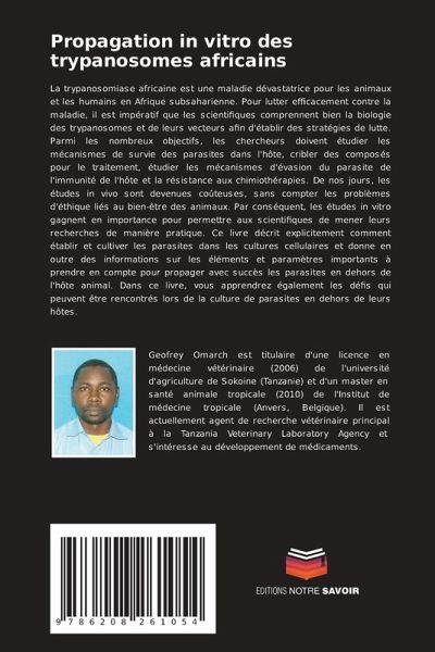 La trypanosomiase africaine est une maladie dévastatrice pour les animaux et les humains en Afrique subsaharienne. Pour lutter efficacement contre la maladie, il est impératif que les scientifiques comprennent bien la biologie des trypanosomes et de leurs vecteurs afin d'établir des stratégies de lutte. Parmi les nombreux objectifs, les chercheurs doivent étudier les mécanismes de survie des parasites dans l'hôte, cribler des composés pour le traitement, étudier les mécanismes d'évasion du parasite de l'immunité de l'hôte et la résistance aux chimiothérapies. De nos jours, les études in vivo sont devenues coûteuses, sans compter les problèmes d'éthique liés au bien-être des animaux. Par conséquent, les études in vitro gagnent en importance pour permettre aux scientifiques de mener leurs recherches de manière pratique. Ce livre décrit explicitement comment établir et cultiver les parasites dans les cultures cellulaires et donne en outre des informations sur les éléments et paramètres importants à prendre en compte pour propager avec succès les parasites en dehors de l'hôte animal. Dans ce livre, vous apprendrez également les défis qui peuvent être rencontrés lors de la culture de parasites en dehors de leurs hôtes.