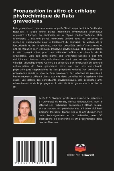 Ruta graveolens L., communément appelée "Rue", appartient à la famille des Rutaceae. Il s'agit d'une plante médicinale ornementale aromatique originaire d'Europe, en particulier de la région méditerranéenne. Ruta graveolens L. est une plante médicinale utilisée dans les systèmes de médecine traditionnelle pour le traitement du psoriasis, du vitiligo, de la leucodermie et des lymphomes, avec des propriétés anti-inflammatoires et anticancéreuses bien connues. L'analyse phytochimique et la multiplication in vitro seront utiles pour une utilisation efficace et durable de R. graveolens. Bien que cette plante soit largement utilisée à des fins médicinales diverses, ses utilisations ne sont pas encore entièrement validées scientifiquement. Ce livre se concentre sur l'évaluation du potentiel antimicrobien de Ruta graveolens ainsi que sur ses constituants phytochimiques responsables de ses propriétés uniques. Un protocole de propagation rapide in vitro de Ruta graveolens par induction de pousses à haute fréquence utilisant divers explants dans un milieu MS a également été établi. Les détails des constituants phytochimiques, des propriétés anti-microbiennes et de la propagation in vitro de Ruta graveolens sont décrits ici.