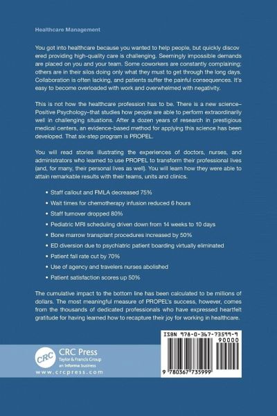 You got into healthcare because you wanted to help people, but quickly discovered providing high-quality care is challenging. Seemingly impossible demands are placed on you and your team. Some coworkers are constantly complaining; others are in their silos doing only what they must to get through the long days. Collaboration is often lacking, and patients suffer the painful consequences. It's easy to become overloaded with work and overwhelmed with negativity. This is not how the healthcare profession has to be. There is a new science - Positive Psychology - that studies how people are able to perform extraordinarily well in challenging situations. After a dozen years of research in prestigious medical centers, an evidence-based method for applying this science has been developed. That six step program is PROPEL. You will read stories illustrating the experiences of doctors, nurses and administrators who learned to use PROPEL to transform their professional life (and, for many, their personal life as well). You will learn how they were able to attain remarkable results with their teams, units and clinics: ¿ Staff callout and FMLA decreased 75% ¿ Wait times for chemotherapy infusion reduced 6 hours ¿ Staff turnover dropped 80% ¿ Pediatric MRI scheduling driven down from 14 weeks to 10 days ¿ Bone marrow transplant procedures increased by 50% ¿ ED diversion due to psychiatric patient boarding virtually eliminated ¿ Patient fall rate cut by 70% ¿ Use of agency and travelers nurses abolished ¿ Patient satisfaction scores up 50% The cumulative impact to the bottom line has been calculated to be millions of dollars. The most meaningful measure of PROPEL's success, however, comes from the thousands of dedicated professionals who have expressed heartfelt gratitude for having learned how to recapture their joy for working in healthcare.