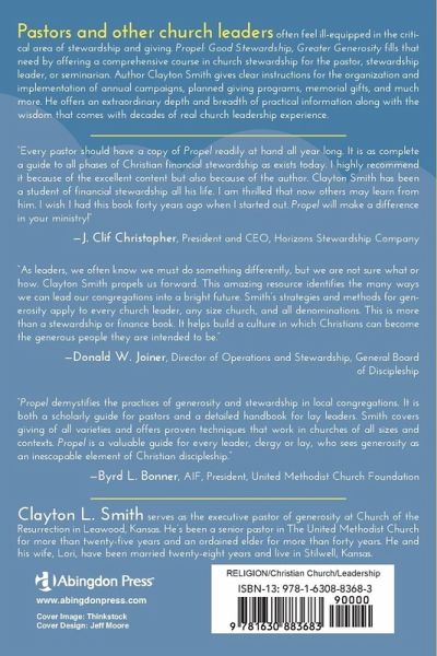 Pastors and other church leaders often feel ill-equipped in the critical area of stewardship and giving. Propel: Good Stewardship, Greater Generosity fills that need by offering a comprehensive course in church stewardship for the pastor, stewardship leader, or seminarian. Author Clayton Smith gives clear instructions for the organization and implementation of annual campaigns, planned giving programs, memorial gifts, and much more. He offers an extraordinary depth and breadth of practical information along with the wisdom that comes with decades of real church leadership experience. "Every pastor should have a copy of Propel readily at hand all year long. It is as complete a guide to all phases of Christian financial stewardship as exists today. I highly recommend it because of the excellent content but also because of the author. Clayton Smith has been a student of financial stewardship all his life. I am thrilled that now others may learn from him. I wish I had this book forty years ago when I started out. Propel will make a difference in your ministry!" --J. Clif Christopher, President and CEO, Horizons Stewardship Company "As leaders, we often know we must do something differently, but we are not sure what or how. Clayton Smith propels us forward. This amazing resource identifies the many wayswe can lead our congregations into a bright future. Smith's strategies and methods for generosity apply to every church leader, any size church, and all denominations. This is more than a stewardship or finance book. It helps build a culture in which Christians can become the generous people they are intended to be." --Donald W. Joiner, Director of Operations and Stewardship, General Board of Discipleship "Propel demystifies the practices of generosity and stewardship in local congregations. It is both a scholarly guide for pastors and a detailed handbook for lay leaders. Smith covers giving of all varieties and offers proven techniques that work in churches of all sizes and contexts. Propel is a valuable guide for every leader, clergy or lay, who sees generosity as an inescapable element of Christian discipleship." --Byrd L. Bonner, AIF, President, United Methodist Church Foundation "Clayton Smith in his wonderful book Propel: Good Stewardship, Greater Generosity, describes six different ways to help people grow in their giving." --Margaret Marcuson, Marcuson Leadership Circle
