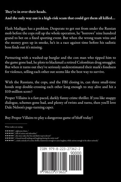 They're in over their heads. And the only way out is a high-risk scam that could get them all killed… Flash Madigan has a problem. Desperate to get out from under the Russian mob before the cops roll up the whole operation, he "borrows" nine hundred grand to bet on a fixed sporting event. But when the wrong team wins and the money goes up in smoke, he's in a race against time before his sadistic boss finds out it's missing. Partnering with a washed-up burglar and the con man who tipped him to the game gone bad, he plots to blackmail a retired Colombian drug smuggler. But when it turns out they've seriously underestimated their mark's fondness for violence, selling each other out seems like the best way to survive. With the Russians, the cops, and the FBI closing in, can three small-time hoods stop double-crossing each other long enough to stay alive and hit a $10-million score? Proper Villains is a fast-paced, darkly funny crime thriller. If you like snappy dialogue, schemes gone bad, and plenty of twists and turns, then you'll love Dale Nelson's page-turning caper. Buy Proper Villains to play a dangerous game of bluff today! _______________________ What readers are saying: ¿¿¿¿¿ "...righteous chaos..." ¿¿¿¿¿ "...full of action and adrenaline." ¿¿¿¿¿ "...this story takes the fun and dials it up to eleven!" ¿¿¿¿¿ "...I found myself smiling and laughing during the entire read." ¿¿¿¿¿ "... a dark comedy of a crime thriller, humorous enough to cause laughter, while serious enough to be taken seriously."