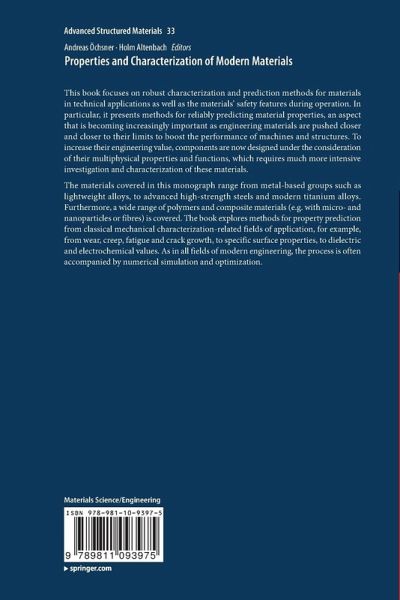 The materials covered in this monograph range from metal-based groups such as lightweight alloys, to advanced high-strength steels and modern titanium alloys. Furthermore, a wide range of polymers and composite materials (e.g. with micro- and nanoparticles or fibres) is covered. The book explores methods for property prediction from classical mechanical characterization-related fields of application, for example, from wear, creep, fatigue and crack growth, to specific surface properties, to dielectric and electrochemical values. As in all fields of modern engineering, the process is often accompanied by numerical simulation and optimization.