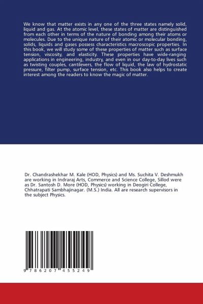 We know that matter exists in any one of the three states namely solid, liquid and gas. At the atomic level, these states of matter are distinguished from each other in terms of the nature of bonding among their atoms or molecules. Due to the unique nature of their atomic or molecular bonding, solids, liquids and gases possess characteristics macroscopic properties. In this book, we will study some of these properties of matter such as surface tension, viscosity, and elasticity. These properties have wide-ranging applications in engineering, industry, and even in our day-to-day lives such as twisting couples, cantilevers, the flow of liquid, the law of hydrostatic pressure, filter pump, surface tension, etc. This book also helps to create interest among the readers to know the magic of matter.
