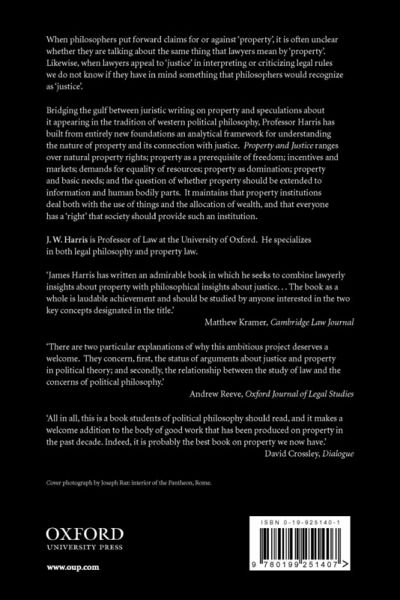 When philosophers put forward claims for or against 'property', it is often unclear whether they are talking about the same thing that lawyers mean by 'property'. Likewise, when lawyers appeal to 'justice' in interpreting or criticizing legal rules we do not know if they have in mind something that philosophers would recognize as 'justice'. Bridging the gulf between juristic writing on property and speculations about it appearing in the tradition of western political philosophy, Professor Harris has built from entirely new foundations an analytical framework for understanding the nature of property and its connection with justice. Property and Justice ranges over natural property rights; property as a prerequisite of freedom; incentives and markets; demands for equality of resources; property as domination; property and basic needs; and the question of whether property should be extended to information and human bodily parts. It maintains that property institutions deal both with the use of things and the allocation of wealth, and that everyone has a 'right' that society should provide such an institution.