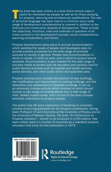 "Property Development" includes such considerations as the objectives, functions, roles and methods of operation of all those involved in the development process, the financial aspects of development, social considerations, planning matters, and others, providing readers with the opportunity to develop their understanding of and their expertise in, the subject.